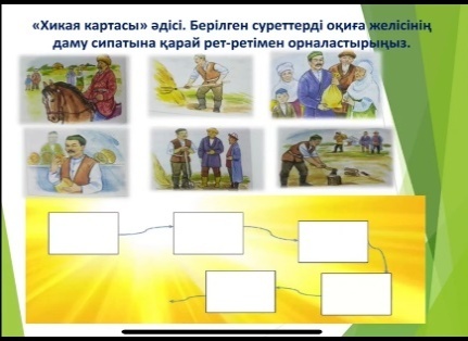 Оқушыларды топтарға біріктіруді ұйымдастыру: Топқа бөлу. І топ. Жомарт ІІ топ. Мейірім ІІІ топ. Еңбек IV топ. Қанағат Оқушылар тапсырмаларды орындау арқылы жақсы көңіл күймен сабақты бастайды Берілген суреттерді оқиға желісінің даму сипатына қарай «Хикая картасына» рет-ретімен жүйелеп қояды.
