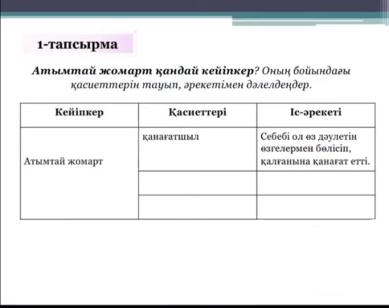 «Миға шабуыл» сұрақтары арқылы өткен сабақ пен жаңа сабақты байланыстырамын. Жомарт Атымтай — Шығыстың көптеген халықтары фольклорында кездесетін кейіпкер, өзінің қайырымдылығы мен жомарттығына сай аты жайылған, халық жадында құрметпен әспеттелетін адам. 6 ғ-да өмір сүрген деген жорамал бар. Түп-төркіні Тай тайпасының ақыны Хатим ибн Абдаллахқа (Хатим-Тай) саяды. Атымтай Жомарт туралы шығармалар ерте кезден белгілі. Олар сюжеттік, жанрлық сипатына қарай үш топқа бөлінеді: 1-топтағы шығармалар хикаяттық сипатта баяндалады. Онда Атымтай Жомарттың өмірі әңгімеленеді, оның жомарт болу себептері баяндалады. 2-топтағы шығармалар — таза қиял-ғажайып ертегілері. Олардың сюжеті бір-бірімен үндес. Мұнда Атымтай Жомарт — асқан бай, таусылмас қазынаның иесі. Оның жомарт болуы осыдан. 3-топтағы шығармалар — тұрмыс-салт ертегілері. Бұларда Атымтай Жомарт — келген қонаққа берер асы жоқ, тақыр кедей. Сонда да жомарт болып бейнеленеді. Адамға деген қайырымдылық, сүйіспеншілік — оның ең басты қасиеті екені ашыла түседі. Атымтай Жомарт туралы аңыз-ертегілер негізінен “Мың бір түннен” бастау алады. Қазақ тіліне аударылып, бірнеше мәрте басылған “Мың бір түн” оқиғалары қазақ оқырмандары арасына кеңінен тараған. Топтық тапсырма (кестемен жұмыс)