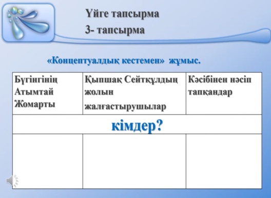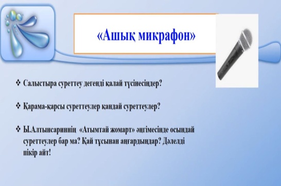 Оқушылар Атымтай жомарт бойындағы қасиеттерді тауып, кейіпкердің әркетімен дәлелдейді. «Ашық микрофон» әдісі арқылы сұрақтарға жауап береді. Оқушылар бүгінгі сабақ бойынша өздерінің қойған смарт мақсаттары негізінде мұғалімге хат жазып, поштаға салады. |