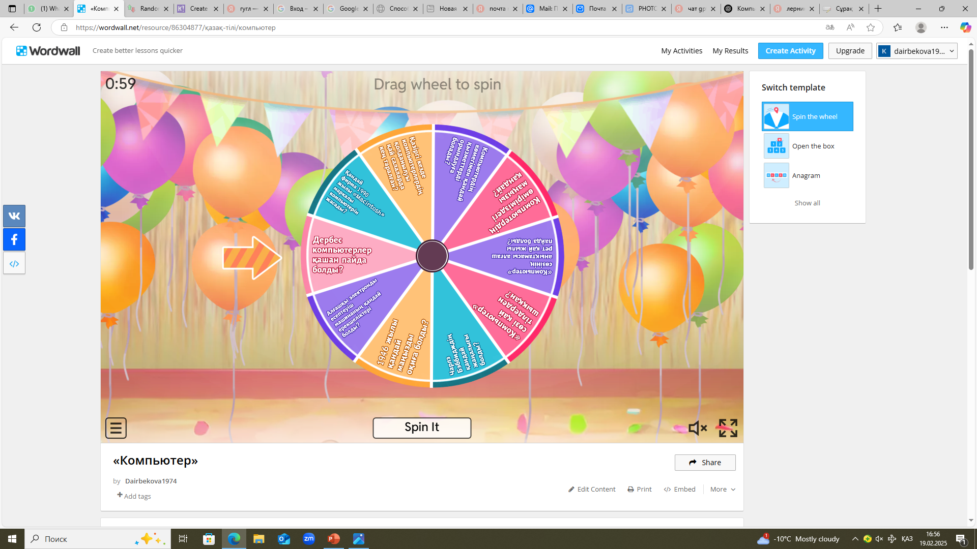 10 сұрақ: 1.«Компьютер» сөзінің анықтамасы алғаш рет қай жылы пайда болды? 2.«Компьютер» сөзі қай тілдерден шыққан? 3.Чарлз Бэббидждің қандай жаңалығы болды? 4.1946 жылы қандай маңызды оқиға болды? 5.Алғашқы электронды есептеуіш машинаның қандай ерекшеліктері бар? 6.Дербес компьютерлер қашан пайда болды? 7.Қандай фирма 1990 жылы «Macintosh» маркалы компьютерін жасады? 8.Қазіргі кезде компьютерлердің қолданылуы қай салаларда кең таралған? 9.Компьютердің көмегімен қандай қызметтерді орындауға болады? 10.Компьютердің өміріміздегі маңызы қандай? Бұрынғы кезде ағартушы ұстаздарымыз, жазушыларымыз өздерін қалай дамытқан. Мына бір өлең шумағынан кімнің өлеңі екенін тауып көріңдерші» Ыбырай Алтынсариннің өлеңі. Ендеше ақын өлеңін
