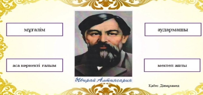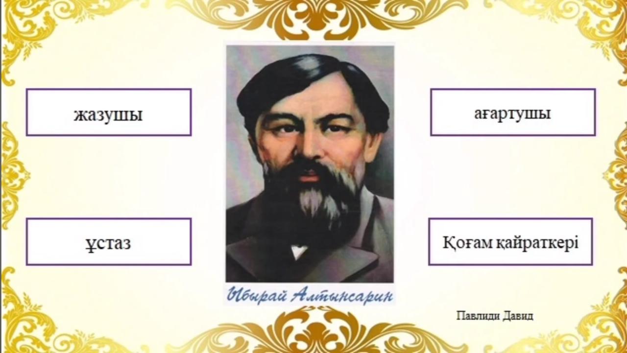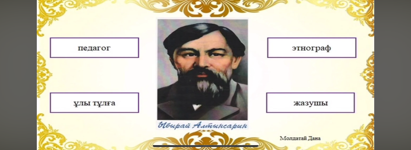 Тақырыптық ақпарат Ыбырай Алтынсарин (1841-1889) — қазақтың аса көрнекті ағартушы-педагогы, жазушы, этнограф, фольклоршы, қоғам қайраткері. Ол 1841 жылы қазіргі Қостанай облысының аумағында дүниеге келген. Әкесінен ерте айырылған ол атасының — белгілі би және старшын Балқожа Жаңбыршиннің қолында тәрбиеленді. Ыбырай бала кезінен бастап білімге және өз бетінше оқып білуге бейім екенін байқатты. Ыбырай Алтынсарин қазақ халқының ағартушылық тарихында және ұлттық мектебінің қалыптасуында терең із қалдырған тұлға. (Мұғалімнің қысқаша түсіндірме сөзі.....) Ақынның өмірімен танысады.