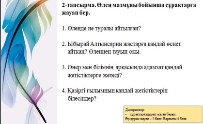 аудио тыңдау. Әрбір оқушы жеке сұрақтарға жауап беру; (Екі топтағы сұраққа жауап берген оқушыларды жұлдызшамен бағалау) 1.Өлеңде өнер мен білімнің адамға қандай пайдасы бар деп айтылған? 2.«Өнер» сөзі өлеңде қандай мағынада қолданылған? 3. Өлеңде қандай мысалдар арқылы өнер мен білімнің маңызды екені көрсетілген? 4. Өлеңде автор жастарға қандай кеңес береді? 5.Өлеңде қай ғасырдың жаңалықтары мен өнері туралы айтылған? 1-топ А).Оқушыларға мәтін беру, мәтіннен сәйкес келмейтін ақпаратты бір бағанға, сәйкес келетін ақпаратты екінші бағанға жаздыру. Ә). Өлеңде қою әріппен жазылған сөздердің аудармасын жазу; 2-топ А).Өлеңнің мазмұны бойынша сұрақтарға жауап беру;