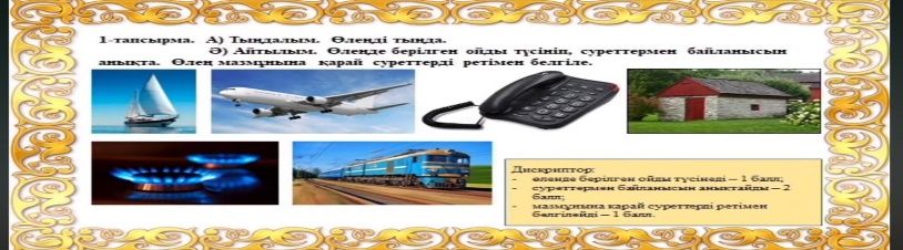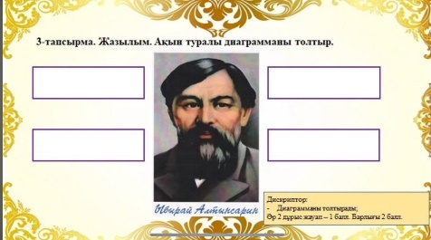Дескриптор Білім алушы -Тыңдалым мәтіні ұсынылады; -Өлеңде берілген ойды түсінеді; -Ақынның өмір жолын таниды-1балл ; -Суреттермен байланысын анықтайды;-1 балл -Мазмұнына қарай суреттерді ретімен орналастырады-1 балл; -Ақын өмірін топтастырады-1 балл