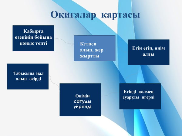 Кезекші сөзі. Психологиялық ахуал Жақсы болу өзіңнен, Жаман болу өзіңнен. Өзіңді өзің ая да, Өзің үйрен өзіңнен. Жақсылық көрсең біреуден, Мен қандаймын деп ойла. Жамандық көрсең біреуден, Мен қандаймын деп ойла Берілген сұраққа оқушылар өздерінің түсініктері бойынша жауап береді. Оқушылар әңгіме сюжетіне назар аударады. Оқушылар оқиға картасын оқиға желісі бойынша жазып шығады. Жазғандарын қорғайды.