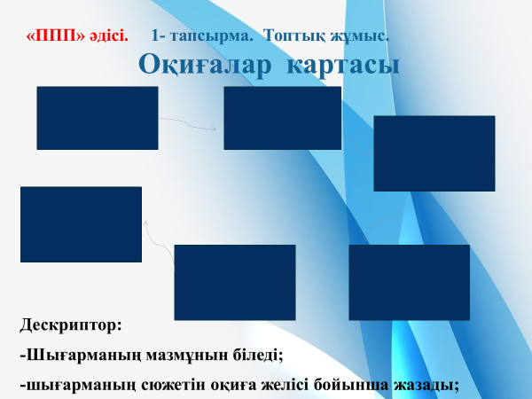 Керемет! Мұндай ойлы пікірлерді ешқашан естімеппін! Дескриптор: -Шығарманың мазмұнын біледі; 1 балл -шығарманың сюжетін оқиға желісі бойынша жазады; 1 балл Дескриптор: -кейіпкердің өзіндік құндылығын анықтайды; 1 балл -сыни тұрғыдан пікір білдіреді; 1 балл -талдау жасайды 1 балл Дескриптор: бүгінгі күннің кейіпкерімен салыстырады; 1 балл кейіпкер іс-әрекетіне өзіндік баға береді. 1 балл