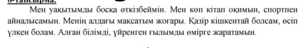8-тапсырманы орындатады. Өлең үзіндісін пайдаланып, өзіңнің мақсатың туралы мәтін құра. Мәтінде қандай дауысты және дауыссыз дыбыстардың жиі қолданылып тұрғанын ескер. Ықтимал жауап: