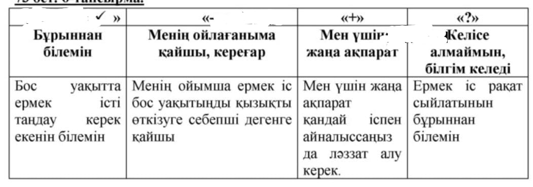 6-тапсырманы орындатады. Мәтіннен алған ақпараттарды талда. Төмендегі белгілермен әр абзацты немесе сөйлемдерді белгіле. Өз ойыңды қорытындылап жаз. Ықтимал жауап: