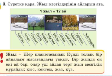Қыс айлары – Желтоқсан , Қаңтар , Ақпан. Көктем айлары – Наурыз, Сәуір , Мамыр. Жаз айлары – Маусым, Шілде , Тамыз . Күз айлары – Қыркүйек , Қазан , Қараша 3-тапсырма.