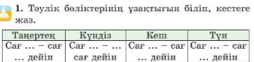 Білу деңгейі. 1-тапсырма. Тәулік бөліктерінің ұзақтығын біліп, кестеге жаз.