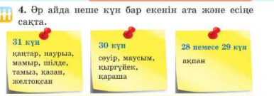 Тәулік бөліктерінің ұзақтығын біліп, кестеге жазып шығады. Жыл мезгілдерінің айларын атап шығады Әр айда неше күн бар екенін атайды , есіне сақтайды . Қай айда және қай күні атап өтілетінін айтады . |