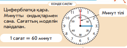 1. 1. 3. 5 уақытты циферблат бойынша 12 сағаттық форматта анықтау/уақыт өлшем бірліктерін (минут, сағат) ажырату; 1. 1. 3. 1 ұзындық/масса/ көлем (сыйымдылық)/уақыт шамаларын ажырату, оларды өлшеу үшін өлшемдер мен құралдарды таңдау, өлшемдер жүргізу |