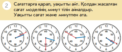 Дескриптор: Сағаттардағы уақытты анықтайды -жарайсың! Сағаттардағы уақытты анықтауда көмек қажет етеді-жақсы! Сағаттардағы уақытты анықтауда өрескел қателеседі-талпын!