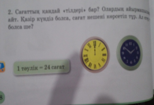 Топпен жұмыс 2-тапсырма 1топқа Сағаттарда қандай тілдері бар? Олардың айырмашылықтарын айту. Қазіргі күндіз болса, сағат нешені көрсетіп тұр. Ал егер түн болса