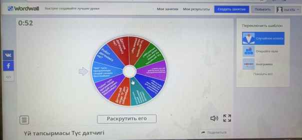1.Оқушылармен амандасу. 2. Алдыңғы білім. Оқушылардан Wordwall платформасында рулетка әдісімен сұрақ-жауап арқылы тексеріледі.