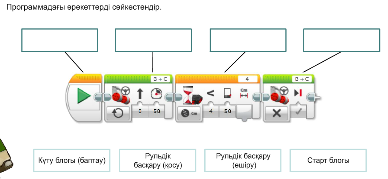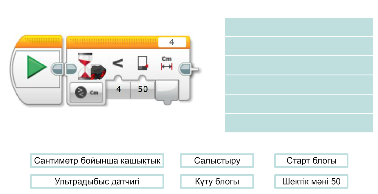 Дескриптор: -Ребусты шешеді Дескриптор: -Негізгі ерминдерді біледі Дескриптор: - Программада ғы әрекеттерді сәйкестендіреді Дескриптор: -Датчик қызметін біледі Дескриптор: -Ерекшелігін анықтайды Дескриптор: - Ультрадыбыстық датчикті программалайды Дескриптор: - Программада ерілген қадамдарды ретімен орналастырады |