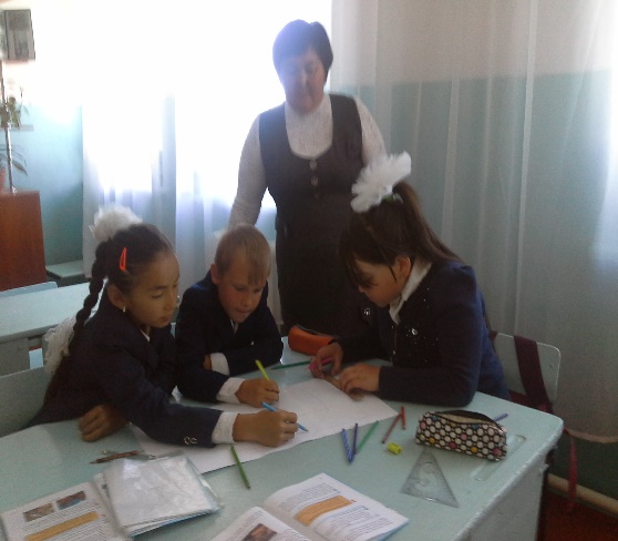 Әр тапсырманы орындаған кезде топ басшысы оқушы білімін геометриялық фигуралармен бағалап отырды.Оқушылыр сабақ кезінде өздерін еркін ұстады.Бір-біріне көмектесіп ,әр қайсысы өз пікірін ортаға салды.