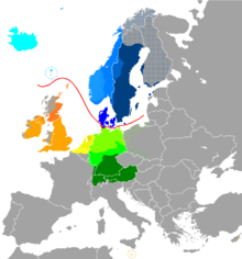 новый (с XVI в. до настоящего времени) — формирование и нормализация национальных языков. В реконструируемом прагерманском языке ряд исследователей выделяет пласт лексики, не имеющей индоевропейской этимологии — так называемый догерманский субстрат[1]. В частности, это большинство сильных глаголов, парадигму спряжения которых также невозможно объяснить из протоиндоевропейского языка[2]. Смещение согласных по сравнению с протоиндоевропейским языком — т.наз. «закон Гримма» — сторонники гипотезы также объясняют влиянием субстрата. Развитие германских языков от древности до наших дней связано с многочисленными миграциями их носителей. Германские диалекты древнейшей поры делились на 2 основные группы: скандинавскую (северную) и континентальную (южную). Во II—I веках до н. э. часть племен из Скандинавии переселились на южное побережье Балтийского моря и образовали восточногерманскую группу, противостоящую западногерманской (ранее южной) группе. Восточногерманское племя готов, продвигаясь к югу, проникло на территорию Римской империи вплоть до Пиренейского п-ова, где смешалось с местным населением (V—VIII вв.). Внутри западногерманского ареала в I веке н. э. выделялись 3 группы племенных диалектов: ингвеонская, иствеонская и эрминонская. Переселение в V—VI вв., части ингвеонских племен (англы, саксы, юты) на Британские острова предопределило развитие в дальнейшем английского языка Сложное взаимодействие западногерманских диалектов на континенте создало предпосылки для формирования древнефризского, древнесаксонского, древненижнефранкского и древневерхненемецкого языков. Скандинавские диалекты после их обособления в V в. от континентальной группы разделились на восточную и западную подгруппы, на базе первой позднее образуются шведский, датский и старогутнийский языки, на базе второй — норвежский, а также островные языки — исландский, фарерский и норн.