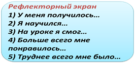 Итог урока. Рефлексия. Учитель предлагает продолжить предложение.