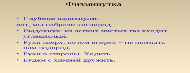 Теперь индивидуально классифицируйте предложенные явления на физические и химические. (учащиеся классифицируют явления). После обменялись тетрадями и проверили друг друга. (приложение) Физические явления: _______ Химические явления: _______ 1.Вода в озере покрылась коркой льда; 2.Появление ржавчины на железном гвозде; 3.Золотую проволоку вытянули в нить; 4.Сжигание бензина в двигателе внутреннего сгорания (в автомобиле); 5.Ледяная игрушка весной растаяла; 6.Высыхание дождевых луж; 7.Для приготовления теста в ложке смешали соду и уксусную кислоту; 8.Морской прилив; 9.Кусочек свинца бросили в азотную кислоту, он «исчез», «растворился», при этом выделился бурый газ; 10.Лёд уронили, он разбился, и получилось несколько ледышек. ОТВЕТЫ ДЛЯ ПРОВЕРКИ: Физические явления: 1, 3, 5, 6, 8,10 Химические явления: 2, 4, 7, 9