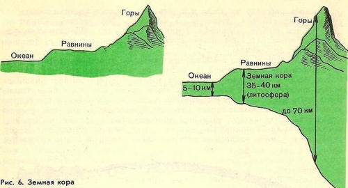 Ученик: Итак, геофизики установили, что до глубины в среднем 30 км земной шар состоит из толщи песка, глины, известняка, гранита и других пород, встречающихся на Земле. Эту толщу горных пород они назвали земной корой. Земная кора - твёрдая оболочка, большая часть скрыта водами океанов. Толщина океанической коры 5-10 км, материковой коры - под равнинами 30 км, под горами - до 70 км. (Показывает рисунок, ученики переносят рисунок в тетрадь.)
