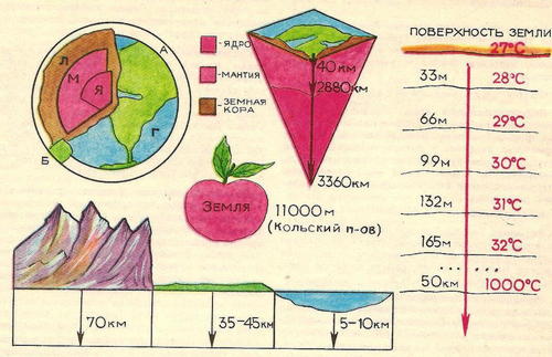 Самая глубокая скважина имеет глубину всего около 12 км. Бурение этой скважины началось в 1970 году на Кольском полуострове. По сравнению с размерами Земли эта величина очень ничтожна. Ведь радиус Земли более 6000 км! Сравните 12 км и 6000 км! (Ученик берёт яблоко и прокалывает кожицу иглой, тем самым демонстрирует соотношение сверхглубокой скважины с размерами Земли.) Но, несмотря на то, что вглубь Земли человек проник всего на несколько километров, кое-какие сведения о её внутреннем строении учёные получили с помощью геофизических методов. Геофизики на поверхности или на некоторой глубине от поверхности производят взрывы. Специальные, очень чуткие приборы записывают, с какой скоростью распространяются колебания внутри Земли. По этим записям и определяют, какие горные породы находятся на глубине. Делают это с помощью специальных таблиц. В них написано, с какой скоростью проходят звуковые волны в различных горных породах. Работа геофизиков очень кропотливая, требует глубоких знаний, большой точности.