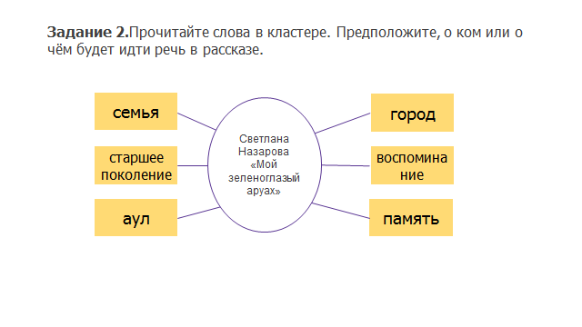 Узнаем немного о поэте . Прочитайте статью о Светлане Николаевне Назаровой . Сегодня мы познакомимся с рассказом «Мой зеленоглазый аруах » По ключевым словам кластера предположите о чем будет или о ком будет идти речь в рассказе.