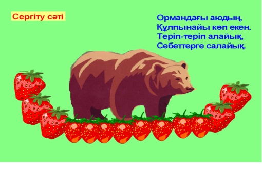 Топтастыру әдісі. «Менің таңдауым» алынған суреттері арқылы топтасады. І топ: аю ІІ топ: ою ІІІ топ. Қою І топ: 1-тапсырма: «Аю қандай?» (Т) қимылмен көрсетеді. Өз білгендері бойынша мәлімет айтады. Ормандағы аюдың, Құлпынайы көп екен. Теріп, теріп алайық, Қалтамызға салайық! «Шапалақ» әдісі арқылы бағалау