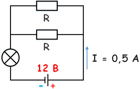. К аккумулятору с ЭДС 12 В, подключена лампочка и два параллельно соединенных резистора сопротивлением каждый по 10 Ом. Известно, что ток в цепи 0,5 А, а сопротивление лампочки R/2. Найти внутреннее сопротивление аккумулятора.