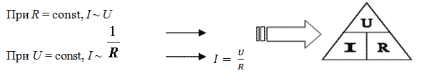 Мы получили математическую запись закона Ома, который читается так: “Сила тока на участке цепи прямо пропорциональна напряжению на концах этого участка и обратно пропорциональна его сопротивлению”. Данный закон немецкий физик Георг Ом открыл в 1827 году.
