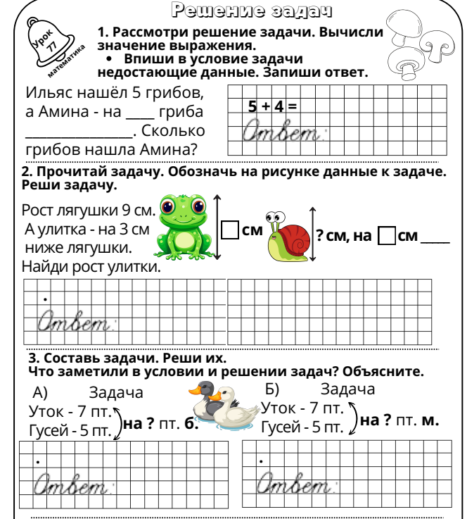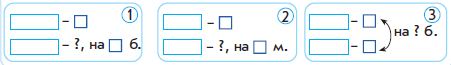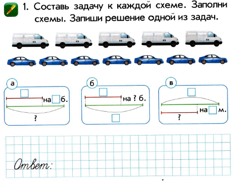 1.5.1.1 Моделировать задачу в виде схемы, рисунка, краткой записи; подбирать опорную схему для решения задачи. 1.5.1.3 Анализировать и решать задачи на: нахождение суммы и остатка; составлятьи решать обратные задачи. 1.5.1.4 Анализировать и решать задачи на: увеличение, уменьшение числа на несколько единиц, разностное сравнение, составлятьи решать обратные задачи. |