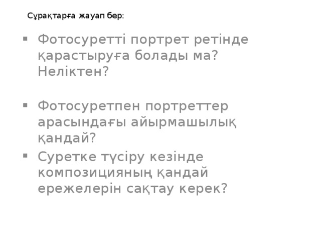 Жаңа сабаққа арналған сұрақтар 5.Сурет салу кезеңдері нешеге бөлінеді. 6.Қазақстанның суретшілерінен кімдерді білесің. 7.Натюрморттың қандай түрлерін білесің. 8.Негізгі үш түсті ата. 9.Түс спекторын ойлап тапқан физик ғалымы. 10.Акварель бояуының орындалу техникасы қалай. 11.Бейнелеу өнерінің қанша түрі мен жанры бар