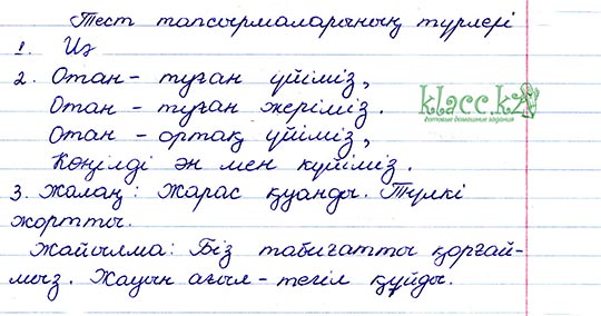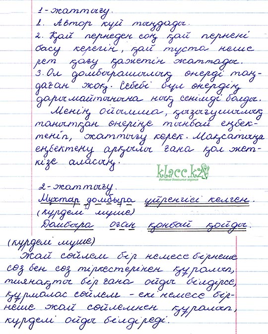 Үй тапсырмасын оқып береді Мәтіннің негізгі тұсын табады. Бірыңғай мүшелерді атайды Өлеңді көшіріп жазып, тыныс белгісін қояды Сызбамен жұмыс жасайды Сөйлем мүшелеріне талдайды Тапсырманы орындайды Сұрақтарға жауап береді Жазушының тегін табады Эссе жазады Кері байланыс жасайды |