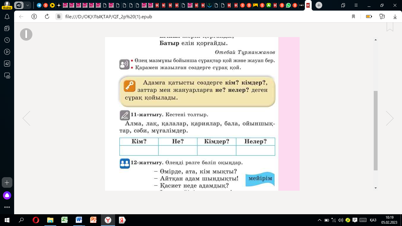 2.4.2.3 Сөз таптарын (зат есім, сын есім, сан есім, етістік) ажырату; 2.2.3.1 - мәтін мазмұнын анықтауға бағытталған сұрақтар құрастыру және жауап беру |