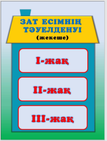 Сергіту сәтін жасайды. Орамалды қағып алған оқушы айтылған зат есімнің қай жақта тұрғанын айтады. ары қарай келесі жақта тәуелдеп басқа оқушыға лақтырады. |