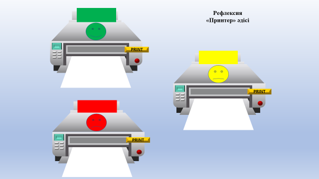 «Принтер» әдісімен сабақтан алған әсерлерімен бөлісуді сұрайды. Жасыл – түсіндім, Сары – сұрағым бар, Қызыл – түсінбедім. |
