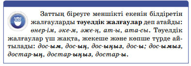 3.4.2.2 тәуелдік жалғауларының қолданысын білу; 3.1.3.1 түрлі жағдаяттағы (қоғамдық ортада) қатысымдық әрекеттерде өз сөзін жүйелі түрде жоспарлап, тілдік нормаларды сақтап сөйлеу. |