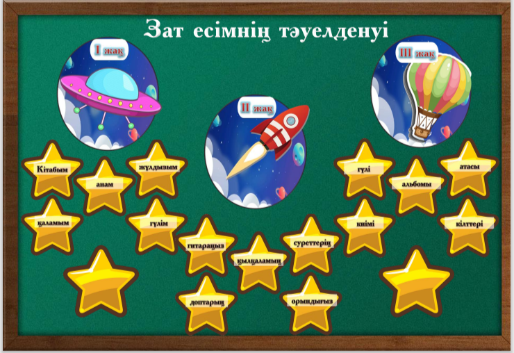 Оқылым. ТЖ Ойлау дағдысы: қолдану Әдіс: «Диктор» Келесі кедергілерден өту үшін топтарға тапсырма береді. 1топқа: Зат есімнің тәуелдік жалғаулары жазылған кесте бойынша 41 жаттығуда берілген жұмбақтың жауабын үш жақта жекеше, көпше түрде талдауды ұсынады. Көрігі және көлігі сөздерінің түбірін табуды тапсырады. 2топқа: Жекеше түрде зат есімдерді тәуелдеуге сөздер береді; 3топқа: Көпше түрде зат есімді тәуелдеуге бірнеше сөздер береді; 4топқа: жұлдызшалардағы тәуелденген зат есімдерді ғаламшарларға орналастыруды тапсырады. |