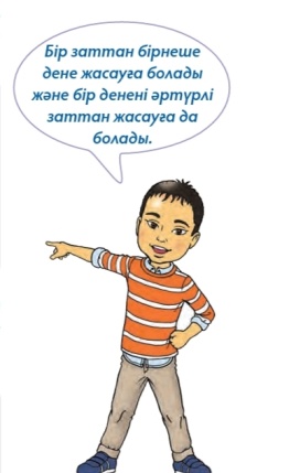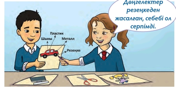 Сұрақтарға жедел жауап береді. Суреттерге назар аударып, бірінші топтағы суреттерге не ортақ екенін анықтайды. Бұл денелердің арасында қандай байланыс барын түсіндіреді. Заттардың қандай қасиеттері болатынын зерттейді. Сергіту сәтін іс-қимылмен көрсетеді. Сұраққа жауап береді. Өз ойларын түсіндіреді. "Зат пен дене" ойынын ұйымдастырады.
