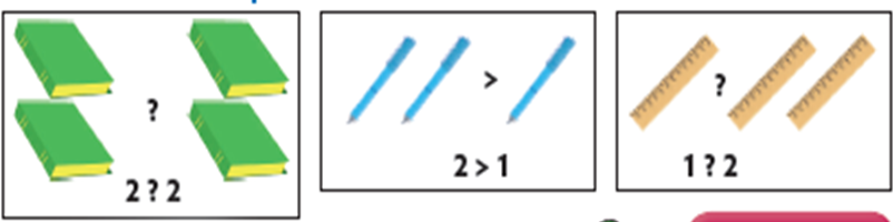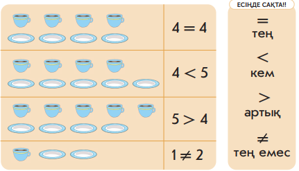 1.5.1.2 ** сандарды, заттарды, тауардың құнын салыстыру кезінде қолданылатын ұғымдарды пайдалану / заттар арасындағы арақашықтықты, бағытты, орналасуын анықтайтын терминдерді пайдалану; 1.5.2.3 сандардың қосындысы мен айырмасын/сандарды салыстыру (артық/кем), көршілес сандарды, сандық аралықтарды, сандар қатарын көрсету үшін сан сәулесін қолдану; 1.5.2.2** «+», «–», «=», «≠», «>», «<» таңбаларын қолдану. |