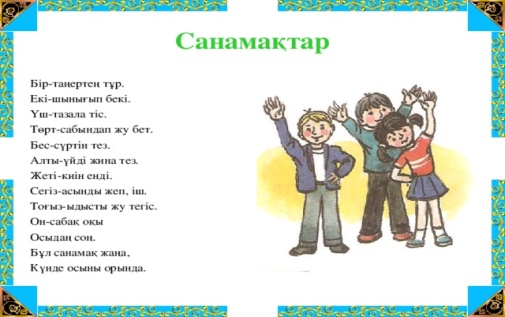Дәптермен жұмыс Дәптердегі №1 тапсырма өз бетімен орындалады. Сабақтың аяғында №2 тапсырма саусақтың ұсақ моторикасын дамытуға берілген. Бастырып жазады. «Шығарып көр» ойыны «Санамақ» ойыны Мұғалім санамақты оқушылармен бірге айтады. Бір дегенім – бесік, Шықтық содан өсіп. Екі дегенім – елім, Далам, тауым, көлім. Үш дегенім – үміт, Үміт артар жігіт. Төрт дегенім – төзім, Төзе білем өзім. Бес дегенім – бақыт Бағалайтын уақыт. Кері байланыс