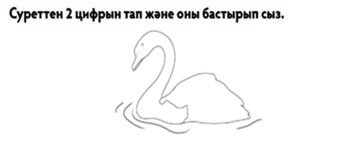 2 санын қалай алдық? (бір және бір). Дәптердегі №1 тапсырманы орындау 2 цифры қалай жазылатынын анықтап қара. (баспа негіздегі дәптердегі жазу). Мұғалім 2 цифрын тақтада жазып көрсетеді. ЕБҚ Суреттен 2 цифрын тап және оны бастырып сыз. Тапсырма зейінді дамытуға бағытталған. Аққудың суретінен 2 цифрының сұлбасын тауып, бояуы қажет.