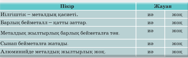 Оқулық пен атласты пайдалана отырып мәтінмен танысадын Негізгі мәліметтерді дәптерге түртіп отырады. Оқушылар сәйкестендіру тапсырмасын орындайды. Оқушылар металл және металл емес заттардың қасиеттерін ажыратып жазады. Оқушылар «Ия, жоқ» әдісі арқылы заттардың қасиеттерін анықтайды. Оқушылар өлеңді оқи отырып, заттардың қасиеттерін анықтап, сұрақтарға жауап береді. |