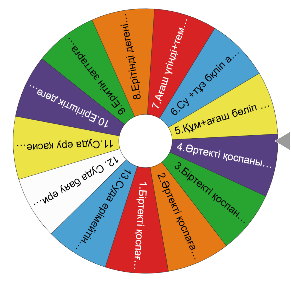 Үйге берілген тақырыпты тексеру: https://spinthewheel.io/wheels/vCPuLyTh9WcEqDyVDmTHcz0xJmU9MA==