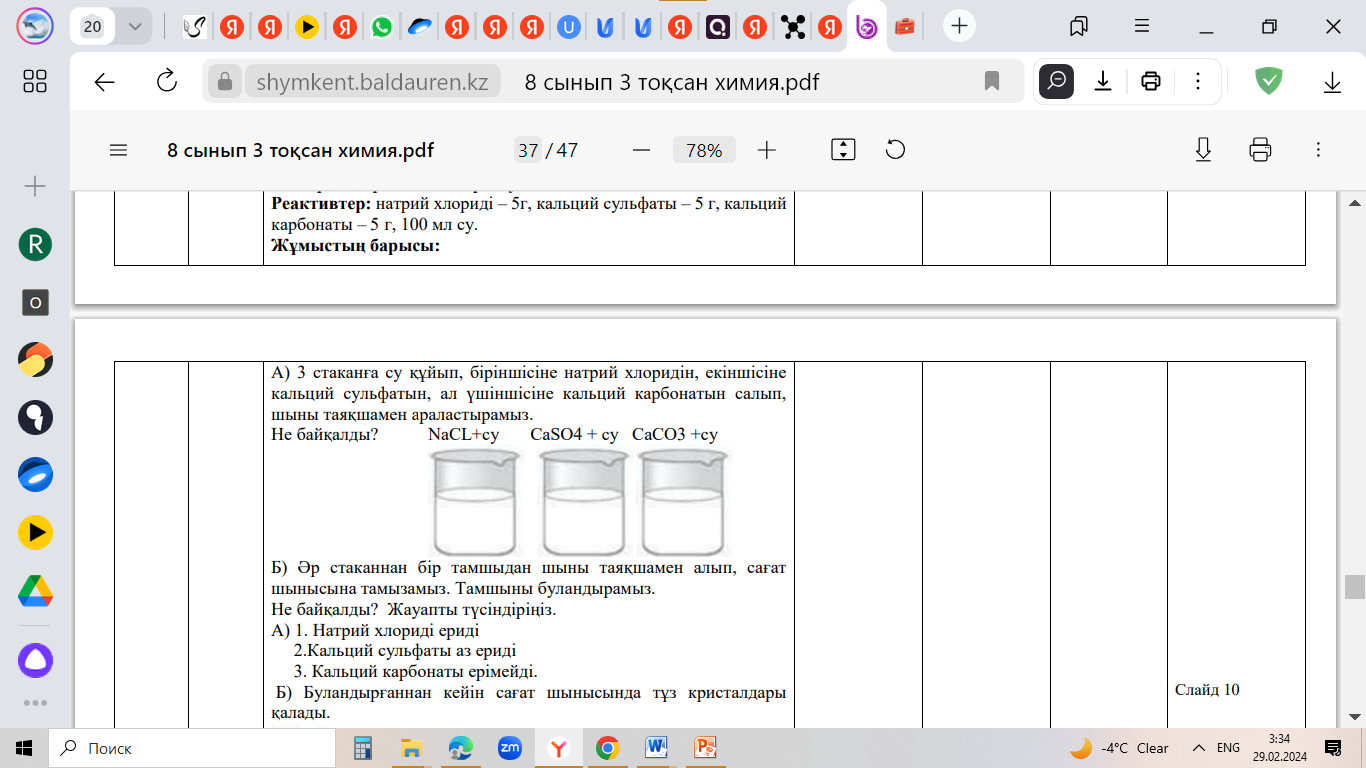 Жұптық жұмыс №5 зертханалық тәжірибе «Заттардың ерігіштігін зерттеу» Мақсаты: заттарды судағы ерігіштігі бойынша жіктеу. Құрал жабдықтар мен реактивтер: натрий хлориді – 5 г, сульфаты – 10 г, кальций карбонаты – 5 г, су – 100 мл, ұстағыш – 1 дана, шыны таяқша – 1 дана, стақан – 3 дана, таразы – 1 дана, сағат шынысы. Қауіпсіздік техника ережелерін ұстан. Химиялық құрал-жабдықтарды абайлап қолдан!