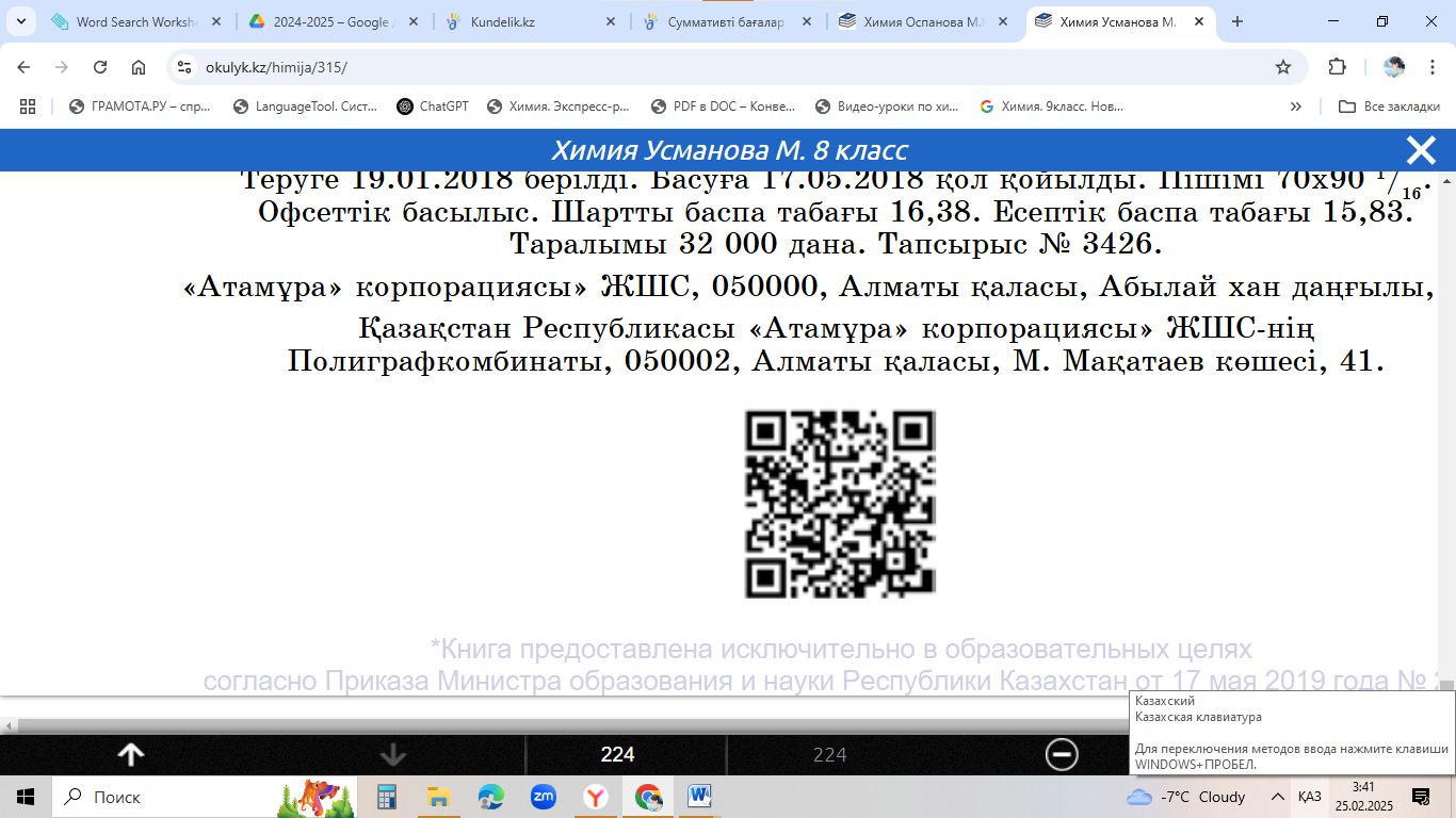 Оқушылар өз бетінше орындалған жұмысты тексеру үшін бір-бірімен дәптер алмасады. Барлық дұрыс жауап -1 ұпай. |