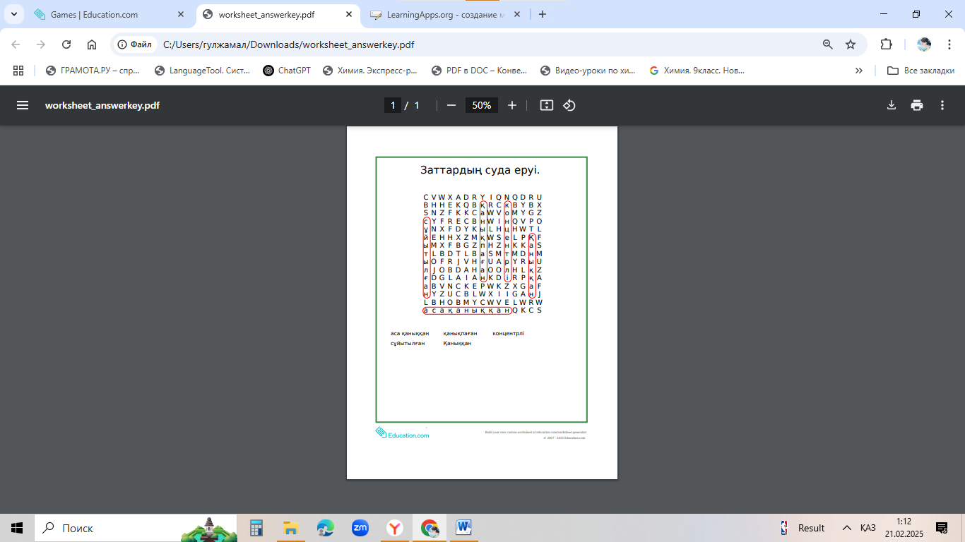 Жауабы: ерітінді; қаныққан; концентрлі; қатты.