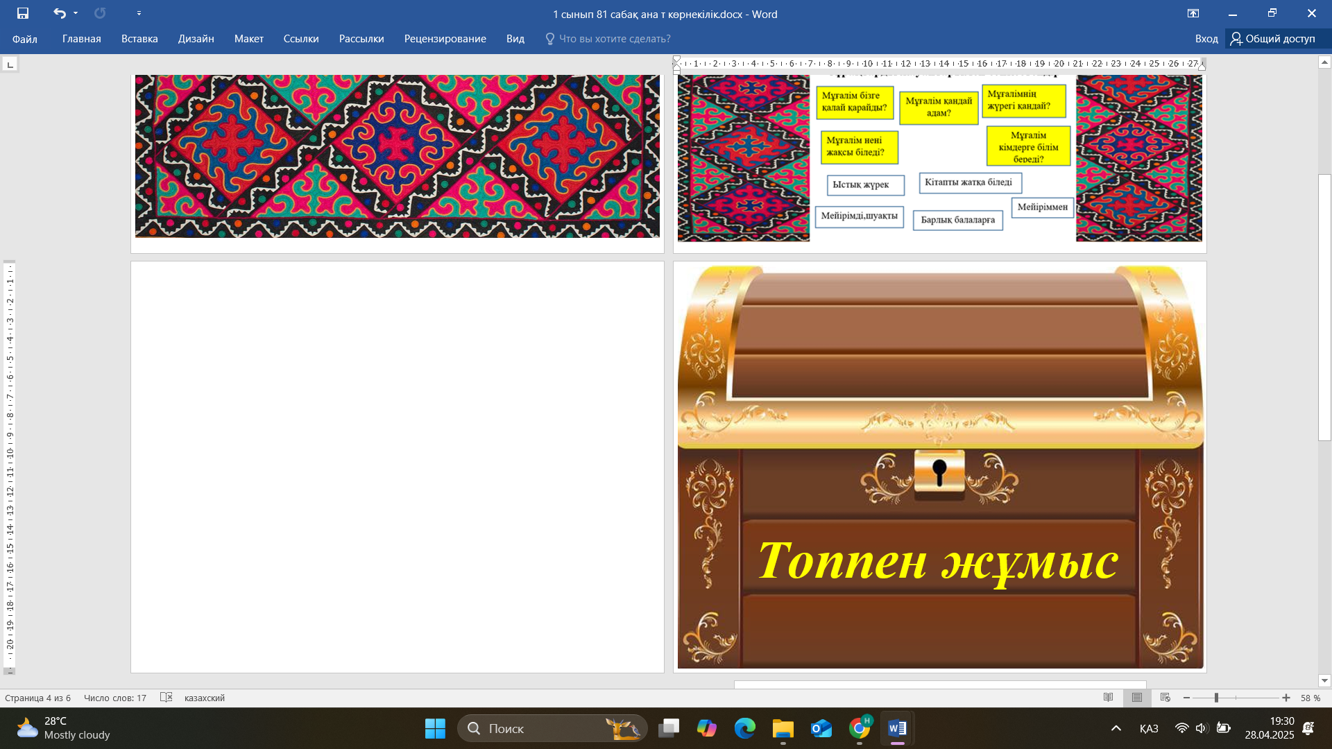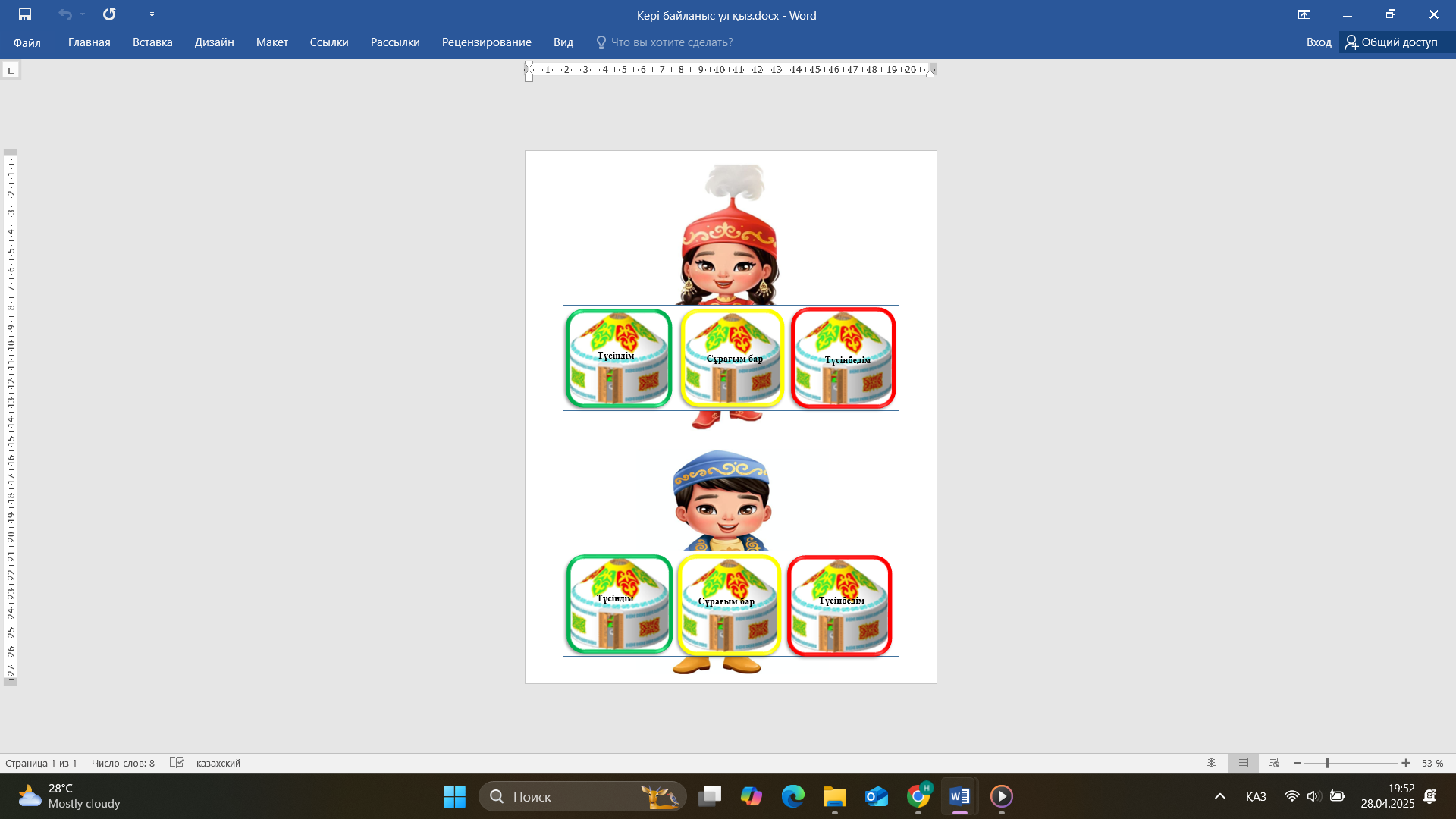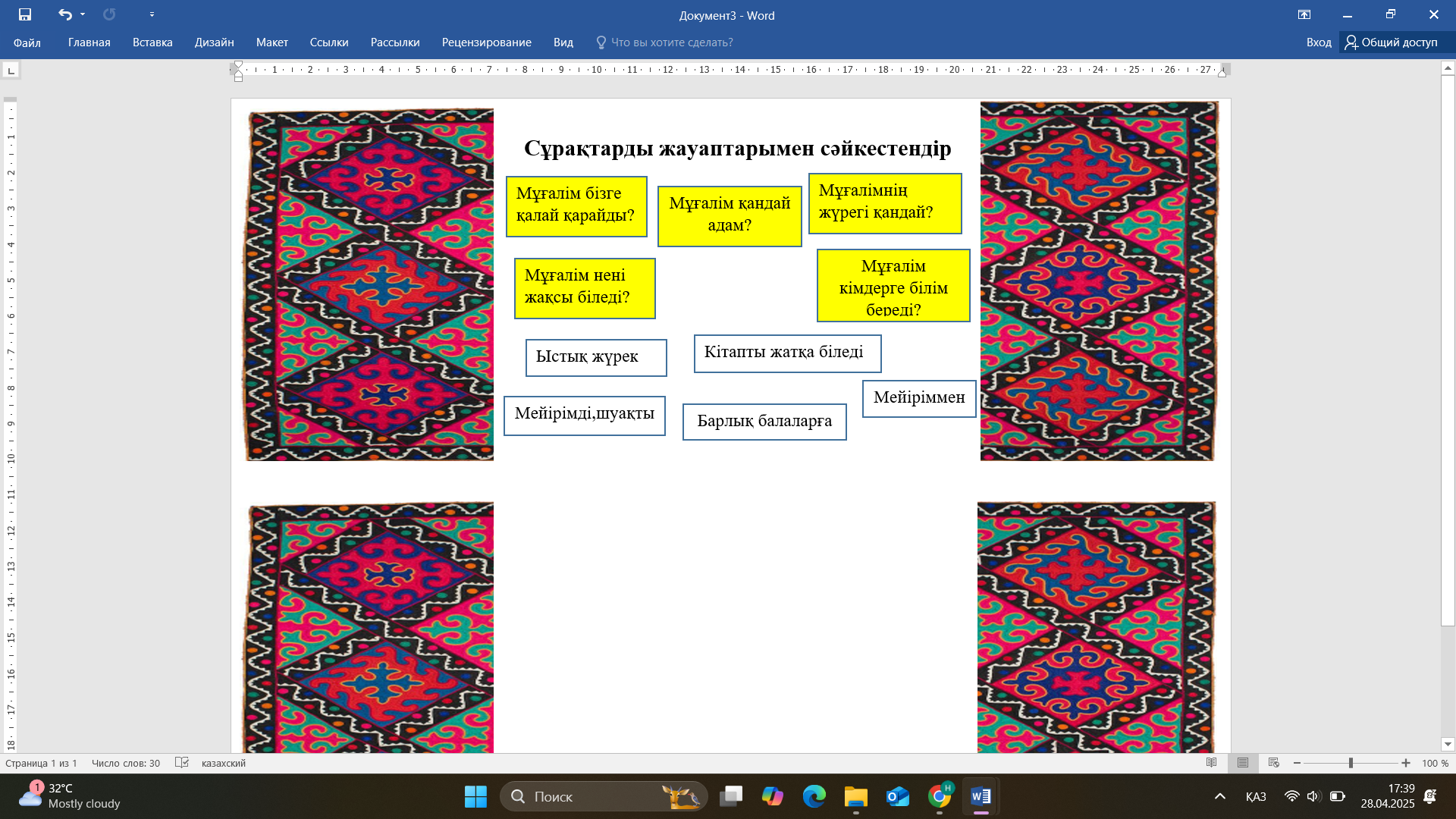 Көркем жазу Мейірімді, ұстаз сөздерін көркем жазады Оқушылар қимылдарды қайталап жасайды. Оқушылар өздеріне берілген тапсырмаларын орындайды. Жеке жұмыс жасайды Оқушылар қолдарындағы ұл мен қызда берілген киіз үйлермен кері байланыс жасайды. |