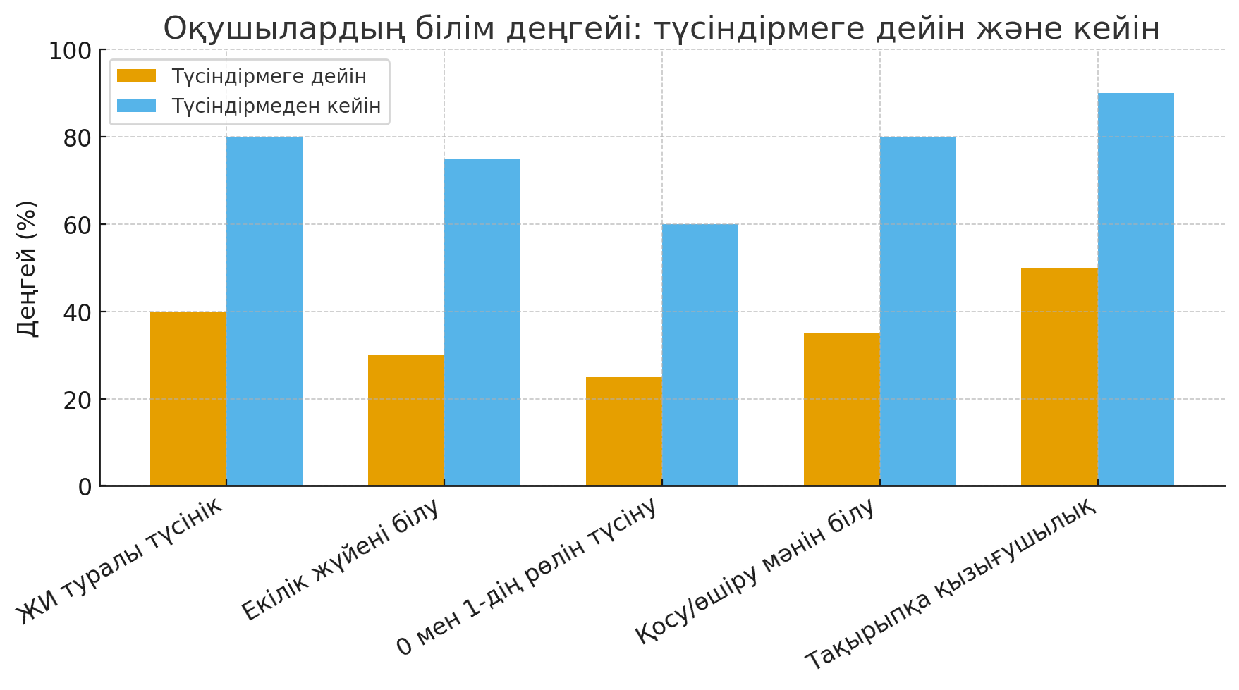 Жасанды интеллект туралы қарапайым тәжірибелер мен ойын түріндегі тапсырмаларды сабақ барысында қолдану оқушылардың қызығушылығын арттырады.