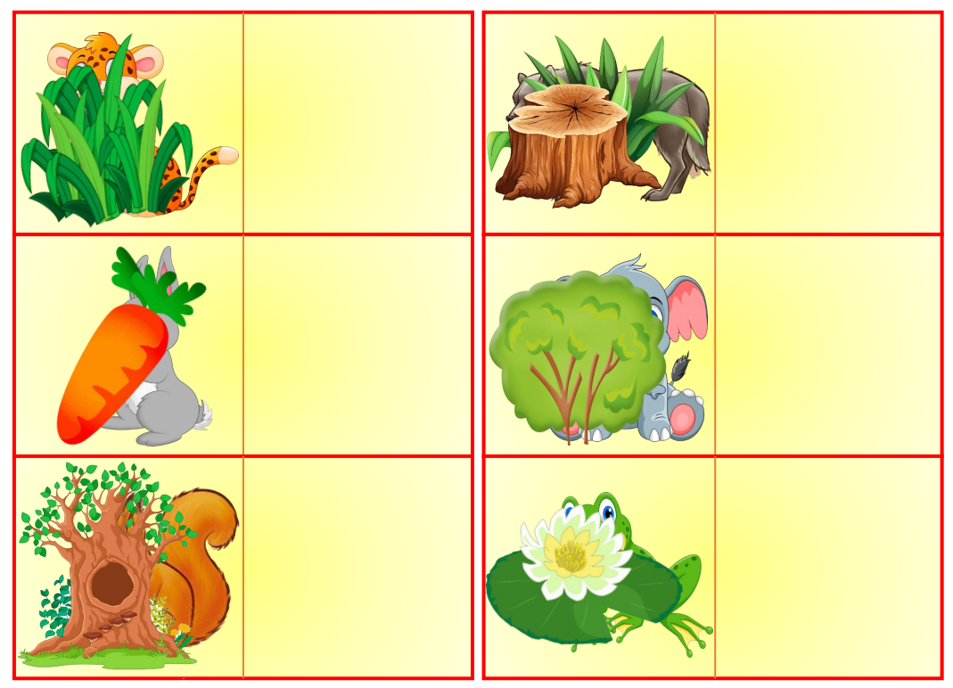 Балаларға жануарлар әлемінен 2 дана карточкалардағы жасырынған жануарларды жылдам тауып сәйкестендіру керек. Топтасып түсіндіре отырып орындайды