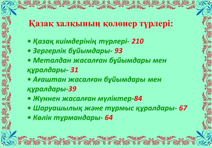 Ұлтымыздың қолөнердегі жетістігін қауым игілігіне айналдыру, жергілікті жерлерде халық шеберлерінің істерін жас ұрпаққа насихаттау, әдемі қолөнер бұйымдарын қазіргі заманға сай қолдана білуге үйрету уақыт міндеті.